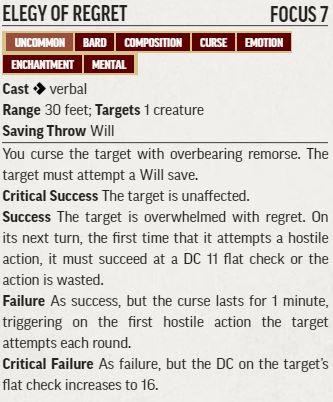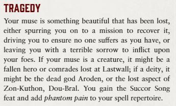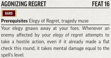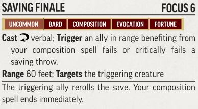 I really wanted to focus on persistent damage more than I had a chance to in the Wayfinder article. This feat was supposed to be sort of like the persistent damage version of inspire competence, giving the bard a way to sort of cheat the system with Performance. Easing suffering through your art is a central concept for the muse, if you decide to go that route. At first I thought this ability was too good for a single action, but the more I thought about it, the more okay I was with it. It costs a focus point, so it’s not spammable, and in my experience you rarely have more than one or two people with persistent damage at a time, so it’s not that huge a deal.
