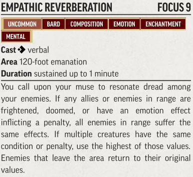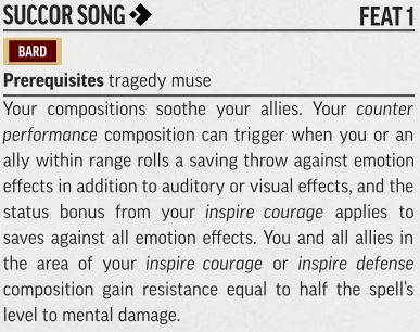 The original version of this feat only added emotion effects to the compositions, which I wasn’t ever really happy with. Emotion effects just aren’t common enough for this to be as good as other muse-granted feats. I wanted to add “pain” effects, but that’s not a thing anymore, and there isn’t a “doom” trait either. I considered “curse” effects but those are also sort of infrequent. I settled on giving resistance to mental damage to both inspire courage as a sort of compromise, and I also gave it to inspire defense because it didn’t really make sense for courage to be better at defending something than defense. I still think it’s a little lackluster, but it’s okay for what it is.