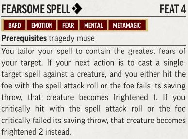 There are two things I knew I wanted to do when I started thinking about this project. One, I wanted to do something with Dirge of Doom since it’s already a great feat for the concept. And two, I wanted to make a feat called Dirge of Gloom to do it. With Doom and Gloom (get it?) you frighten things and give them persistent mental damage. This capitalizes on the muse’s power to really tear into a creature’s psyche, assuming it has one.