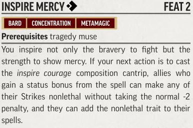 Wizards can take a feat at level 2 called Nonlethal Spell that lets them cast things like meteor swarm in a way that won’t actually kill anything. Rather than just make that feat for bard, I wanted to make it so you can spread it to your party. Negating a -2 penalty can be substantial, but how often you actually use nonlethal attacks is probably pretty low. Hopefully this feat might make it more appealing to do so. It’s worth noting it says allies “can” make their stuff nonlethal, so it isn’t forcing the team to use it.
