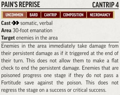 What’s the opposite of comfort? Pain! What’s the opposite of removing persistent damage? More pain! Obviously this combos well with Dirge of Gloom, but I made it the same level so it wasn’t such an automatic progression. You can also completely skip Doom and Gloom but pick this up if you already have other persistent damage like a wounding dagger or alchemist fires.