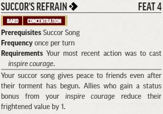 I wanted the muse to have a way to counter fear effects. Unfortunately, the base feat you get kind of buries the importance of fear in the “emotion” trait. Succor’s Refrain is meant to remedy this. Now your inspire courage not only helps prevent fear but it can remove fear as well if you keep going with it. Champion gets a similar ability through aura of courage, but this is a much wider area, so I made it cost an action to balance out.