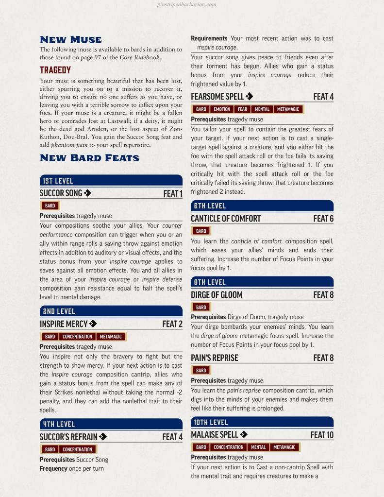 So, in this post, I present the Tragedy Muse in its complete form. I’ll go through each part here in full (the feats that give Focus Spells all just give the spell and a Focus Point if it isn’t a cantrip, so I skipped reprinting those). If you’d like a sheet with the complete rules, you can download the files on the side.
