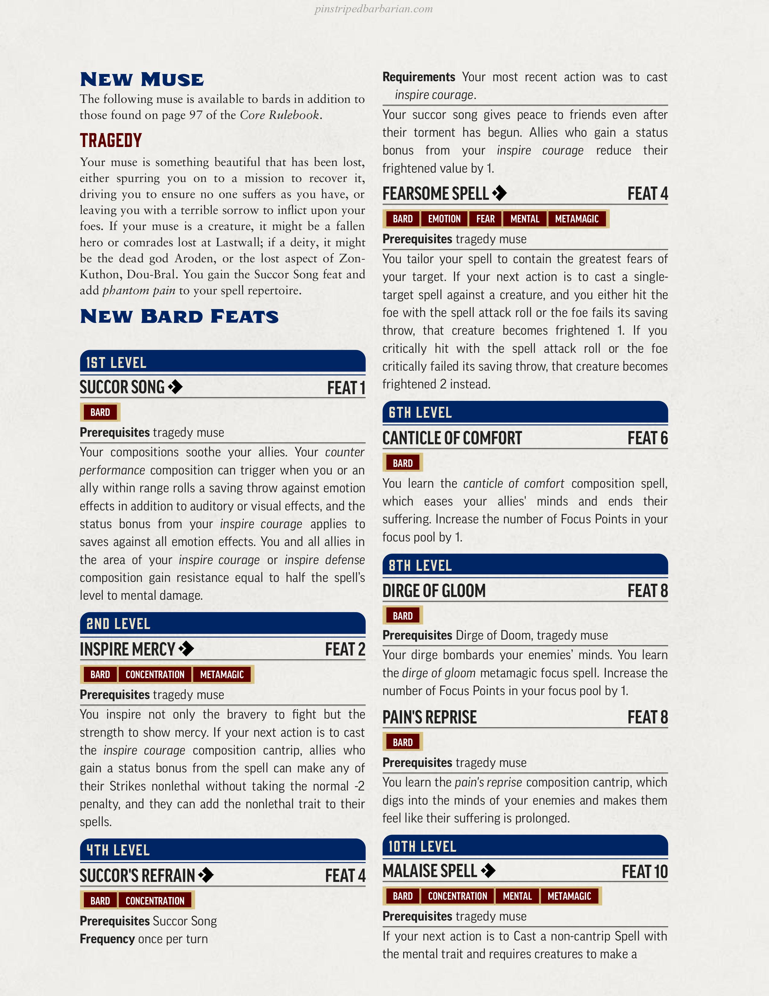 So, in this post, I present the Tragedy Muse in its complete form. I’ll go through each part here in full (the feats that give Focus Spells all just give the spell and a Focus Point if it isn’t a cantrip, so I skipped reprinting those). If you’d like a sheet with the complete rules, you can download the files on the side.