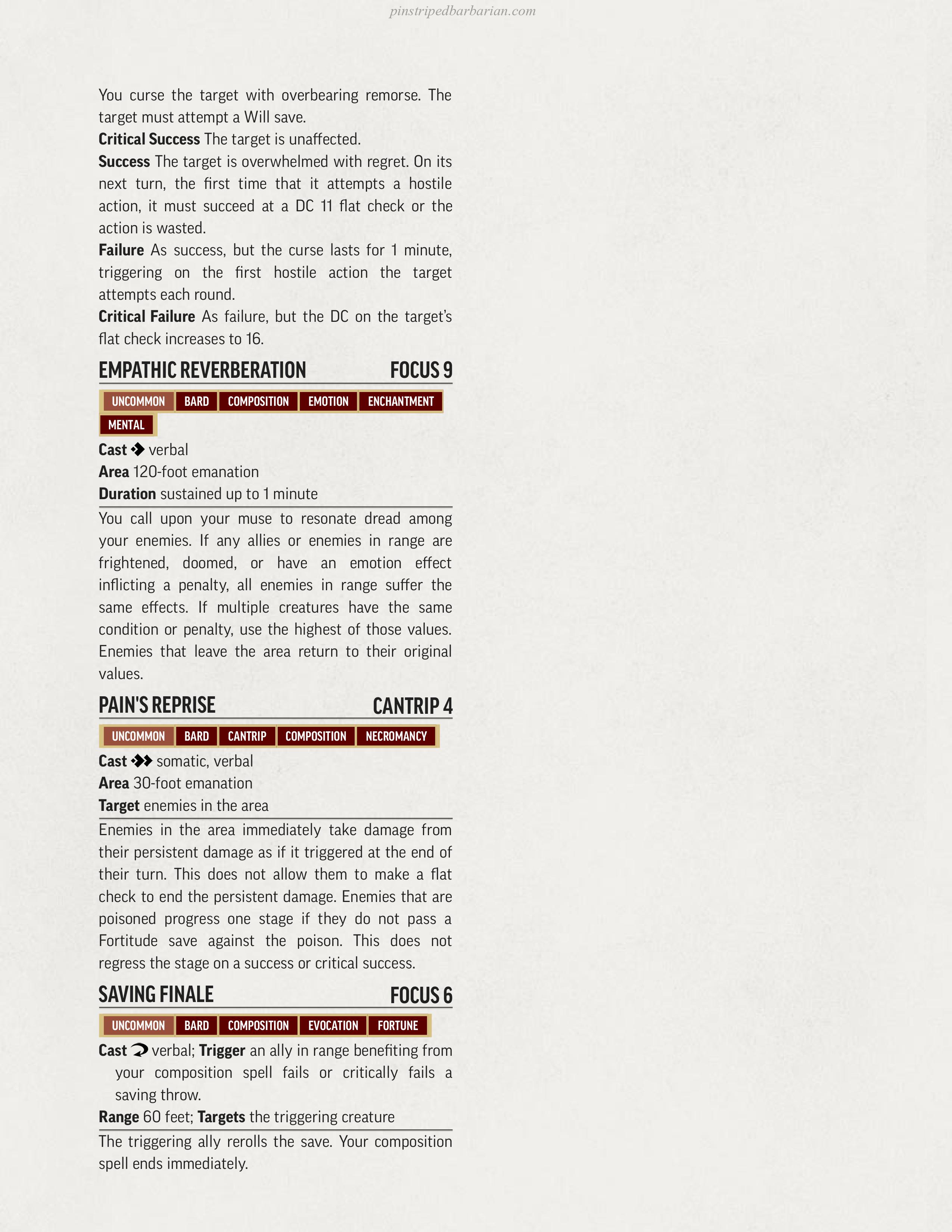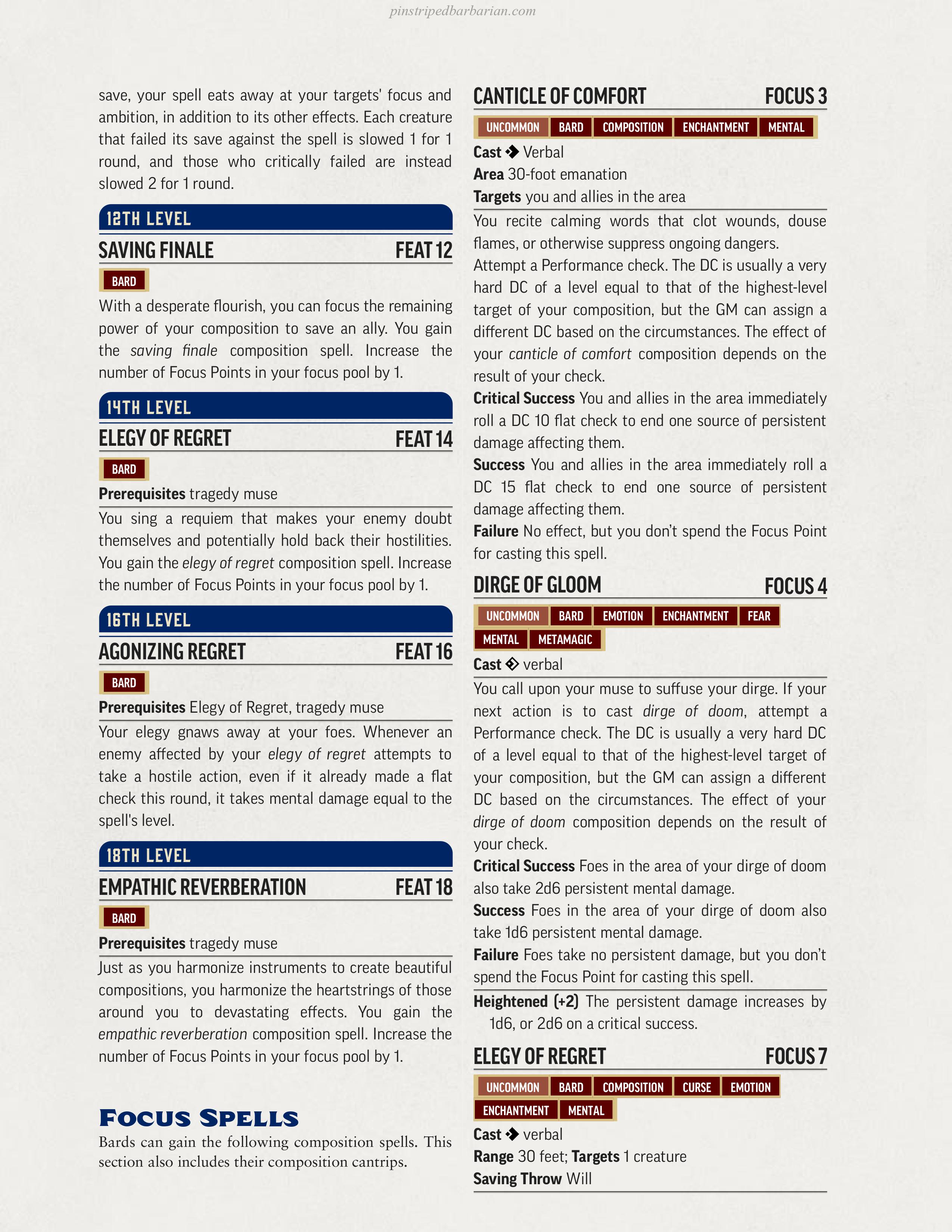 I really wanted to focus on persistent damage more than I had a chance to in the Wayfinder article. This feat was supposed to be sort of like the persistent damage version of inspire competence, giving the bard a way to sort of cheat the system with Performance. Easing suffering through your art is a central concept for the muse, if you decide to go that route. At first I thought this ability was too good for a single action, but the more I thought about it, the more okay I was with it. It costs a focus point, so it’s not spammable, and in my experience you rarely have more than one or two people with persistent damage at a time, so it’s not that huge a deal.