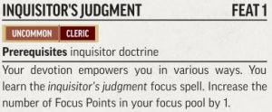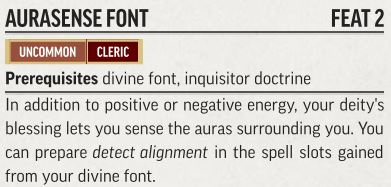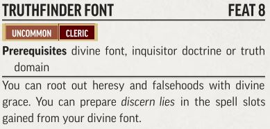 Once again, a bonus spell that inquisitor got in 1e that works great with divine font. Once again, an ability that works well with a related domain and plays into inquisitor’s looser relationship with domains. Once again, an option that is uncommon in 2e. Regardless, this is one feature I had in mind from the very beginning, and I’m still happy with it like this. With it, inquisitor is still the best lie detector in town.