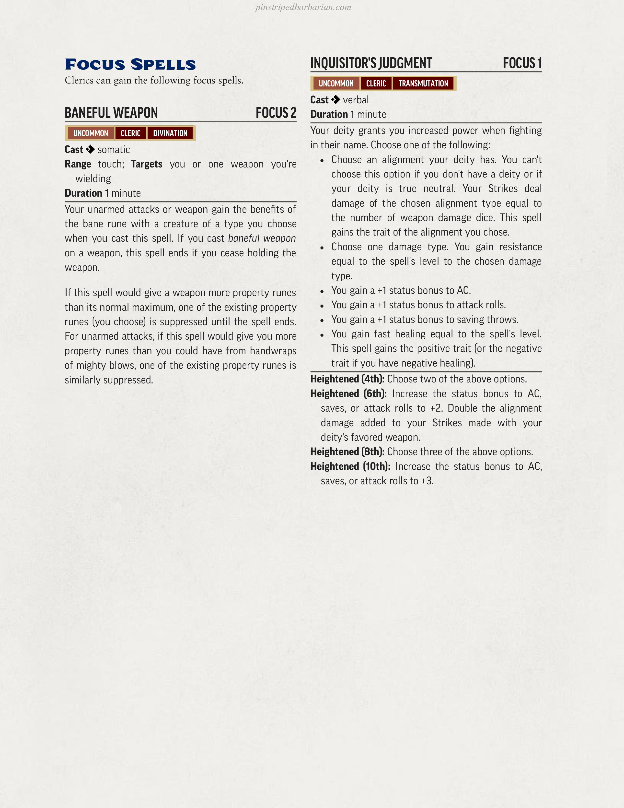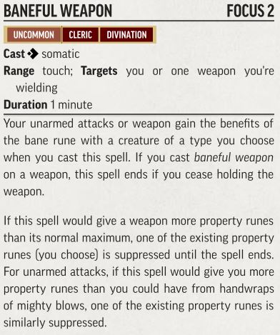 As mentioned above, having some domain-centric feats that the inquisitor doctrine can cheat its way into is a nice way to emulate the class’s domain access. Originally I didn’t know how I’d include the Bane ability. Luckily, Secrets of Magic not only reintroduced the weapon property as a rune, but it also provided the conflux spell runic impression that does something similar.