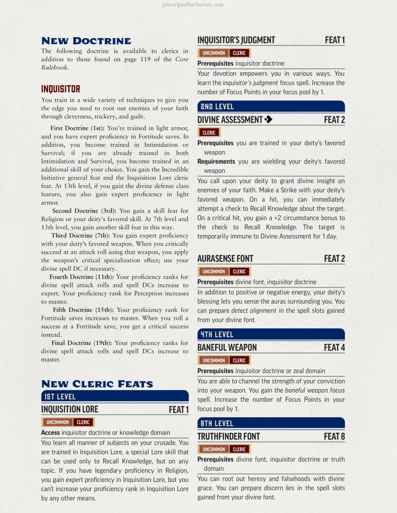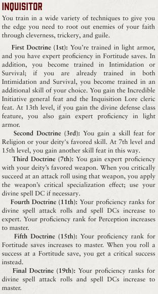 Since the 1e class was a lot like warpriest in 1e, the doctrine’s progression is pretty similar to the warpriest doctrine. Both were less spell focused, so they both max at master spell proficiency. Having a bit more martial focus translates to increasing proficiency earlier on. Both get increased Fortitude saves over what cloistered cleric gets. I stuck with light armor since even warpriest got knocked down to medium only, and inquisitor was always one degree lower than warpriest. No Shield Block for the same reasoning.