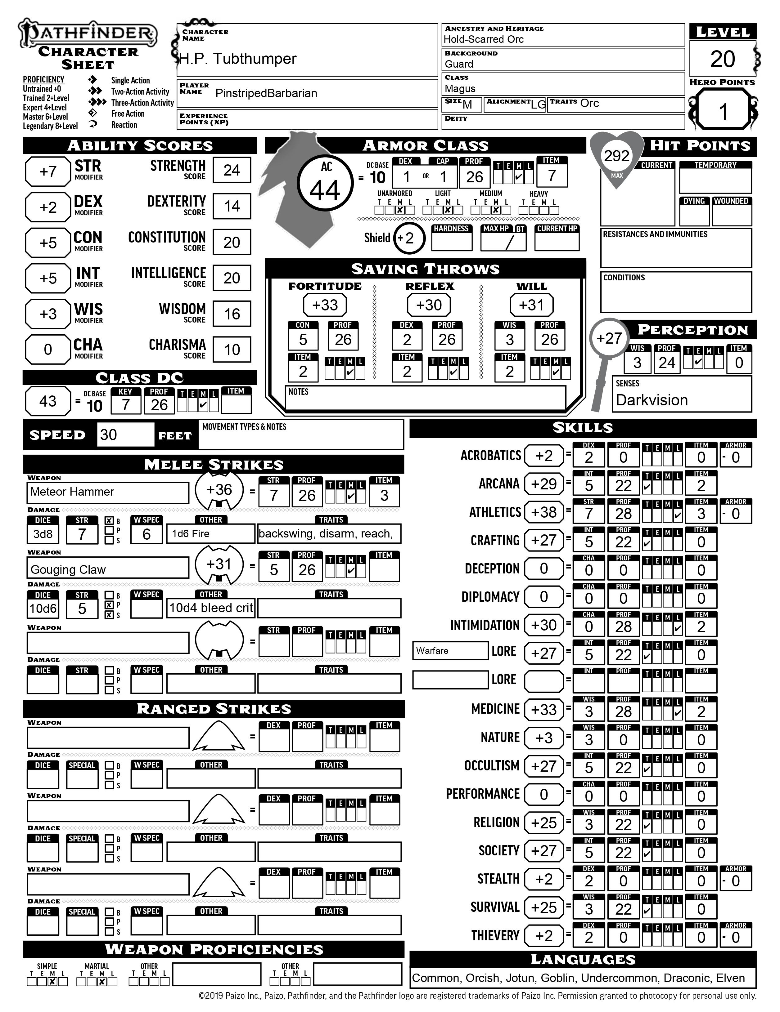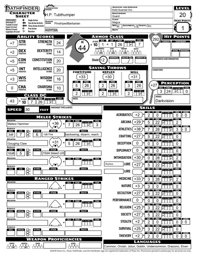 This is an updated version of the magus I played during the playtest for the Secrets of Magic classes. As always, I have the character sheet available for viewing in the sidebar (or bottom for mobile). We had a group with two magi and two summoners, which was… interesting. Probably not the best way to test the classes in a party, but we had a divine summoner as a healer, a different one with a lot of skills, a blasty magus, and a tanky magus – me. To do so, I built the character to do a lot of aoe, apply a lot of debuffs, and have as many opportunities to get temporary hit points as possible. In the playtest, the class got the hp whenever they cast a spell, not at the beginning of the turn, so this was a bigger deal then. Even if the temp hp doesn’t stack, I could theoretically bring up a new buffer of hp even after a different one depletes. Hence the name Tubthumper, because his hp gets knocked down, but it gets up again. Other than that a stream of replenishing hp and a silly name reference, the character was all about applying debuffs and keeping enemies nearby.