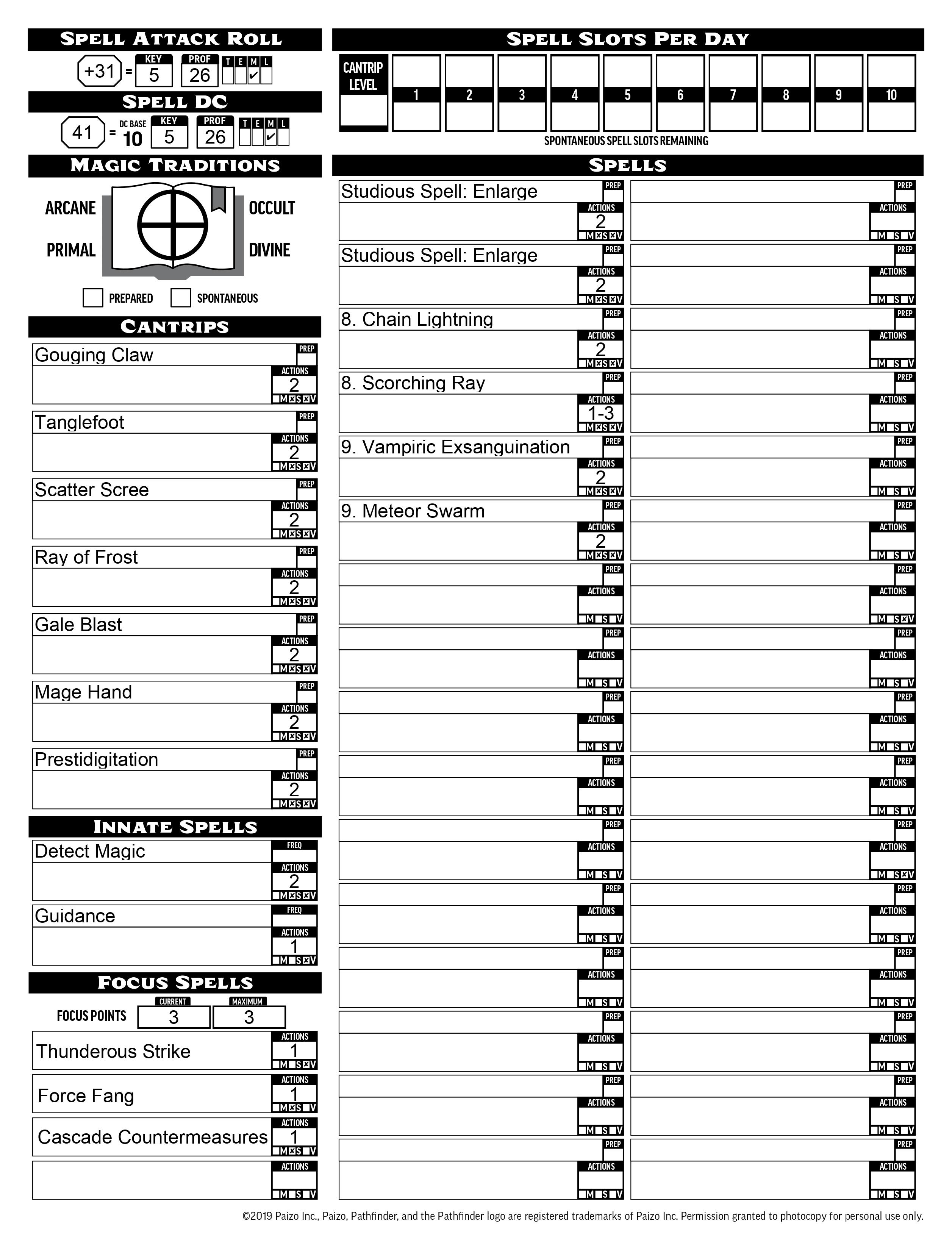 With a normal spellcaster, I spend maybe a few minutes picking cantrips and a lot longer on spells. With magus, it’s the exact opposite. Grab a couple good damaging spells to go with spellstrike. The cantrips though… I have struggled with them. The spellstrike options make it much more important as they’re really the spammable thing for their staple ability, be it compounding effects or just adding on damage. I feel like magi are more likely than most characters to take the cantrip expansion feat, but I just didn’t have the room for it. Telekinetic projectile and gouging claw are the best cantrips for pure damage if the type doesn’t matter, but gouging claw is slightly better for the critical bleed damage. Ray of frost is the longest ranged option if you really need it and offers diversifies your damage types. Personally, I love tanglefoot spellstrikes since they can potentially keep enemies in our reach, eat up actions for Escape attempts, or allow for better personal positioning, perfect for battlefield control. Gale blast and scatter scree are for use with expansive spellstrike to have more battlefield control, notably to force enemies into situations where they have to trigger Attack of Opportunity. I’d really love to add electric arc, acid splash, and/or produce flame for more damage versatility, but this is meant to be a tanky build, not a nuker. Control and debuffs are more important to doing what this character needs to do.