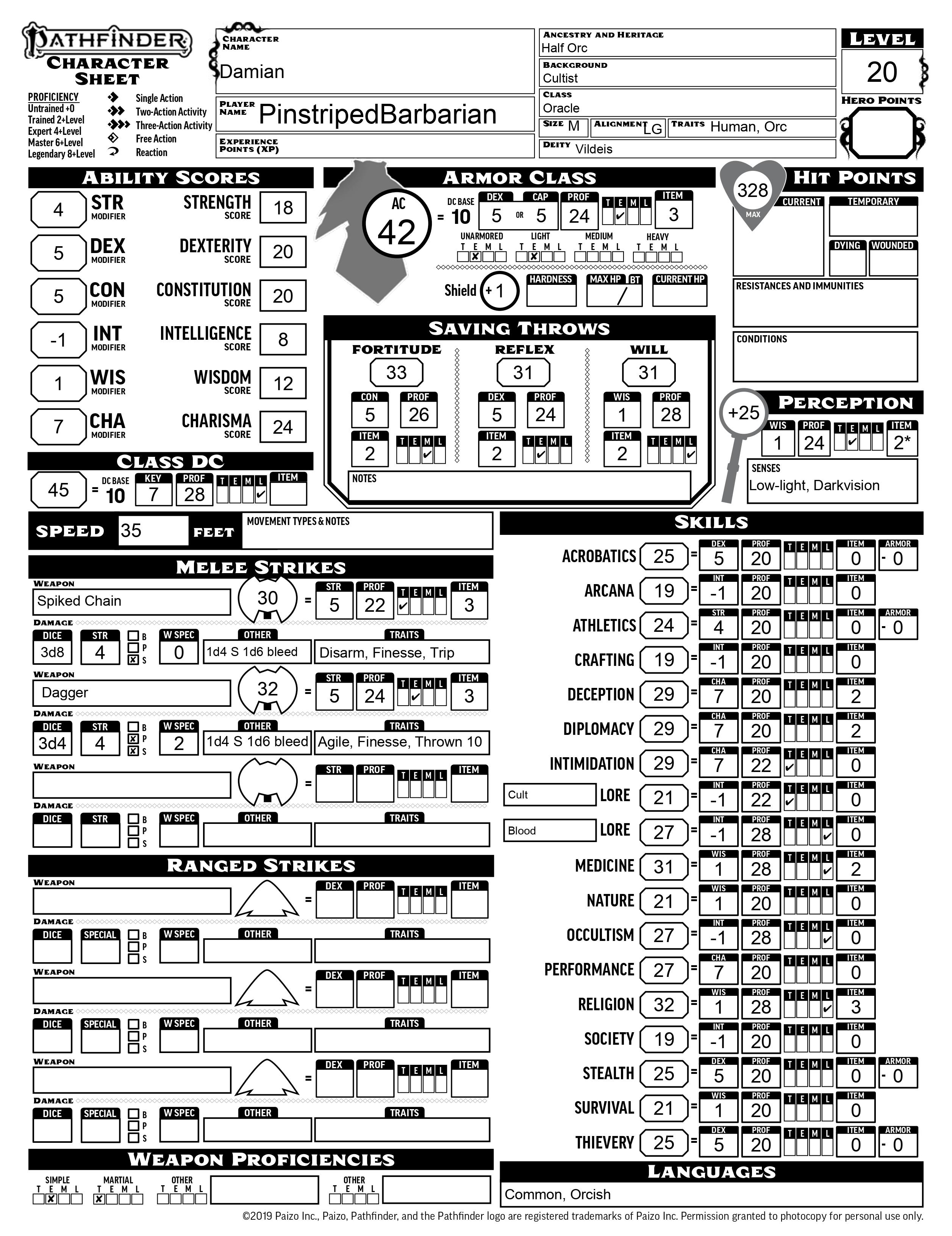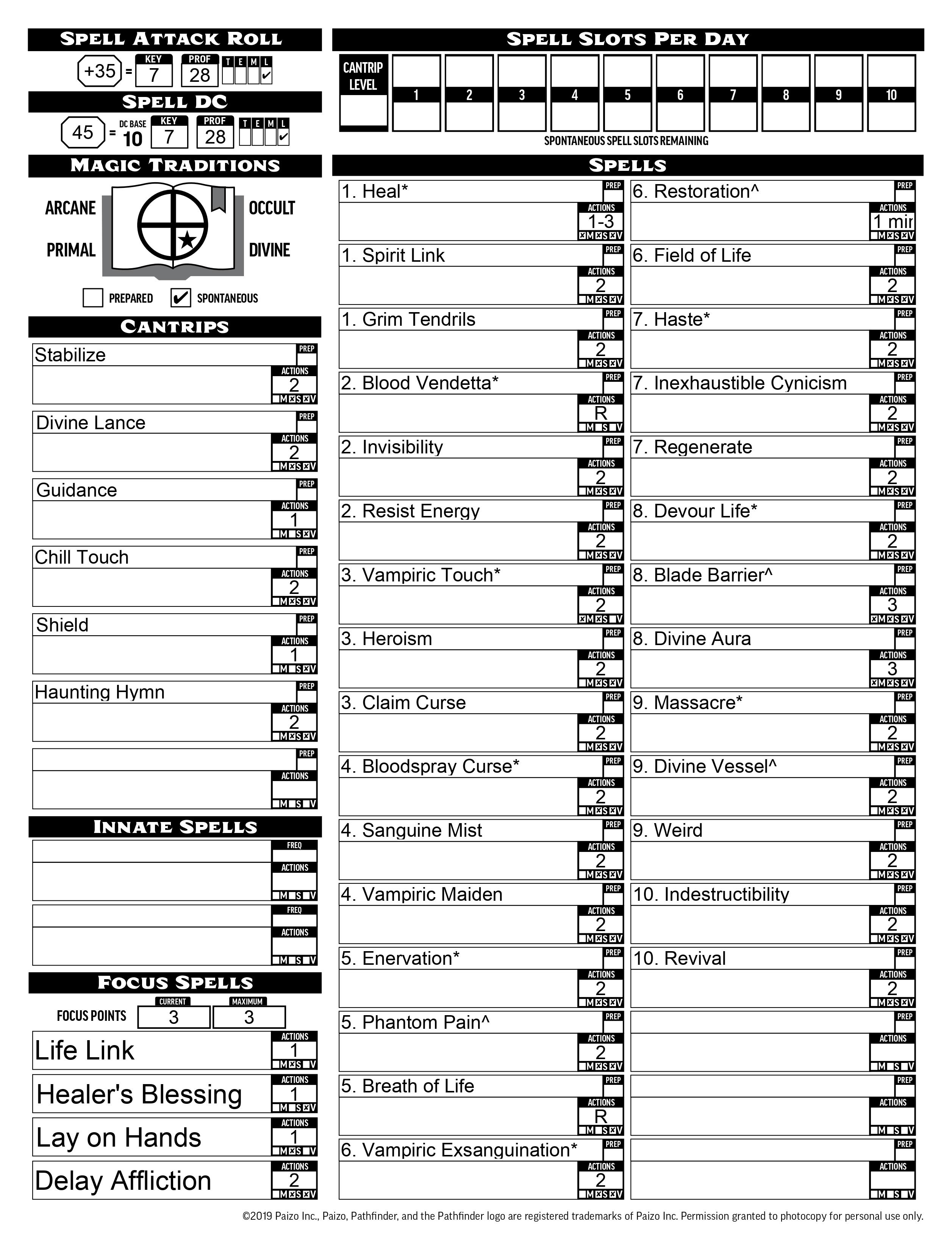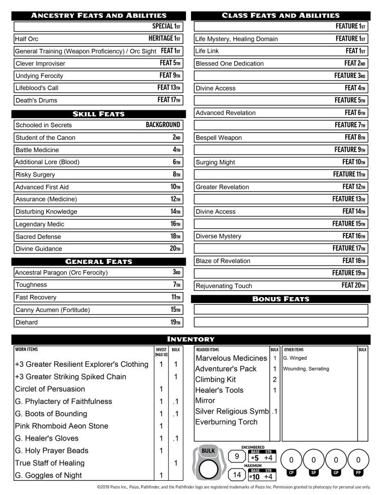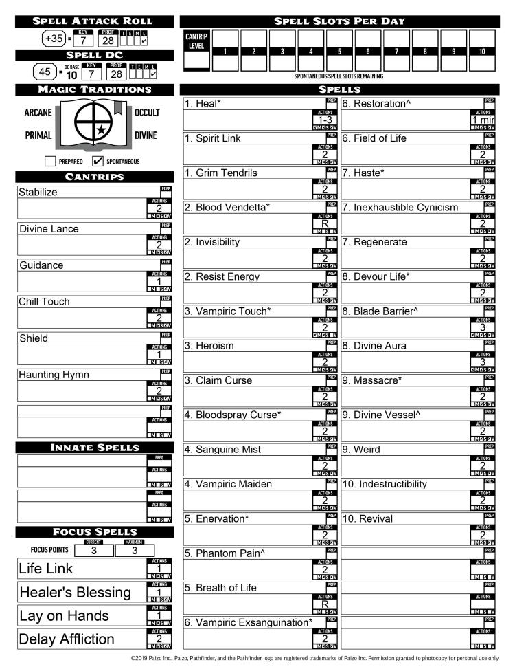 Other life oracles might focus on healing and ranged spells, maybe building themselves up defensively to ensure they have enough bulk to share their hit points safely. Not Damian. He runs straight into melee. He relies on abundant temporary hit points from vampiric spells to keep him going. He either attacks or moves into position with one action, spending the other two nearly every turn to cast a spell. The spells I listed are the ones that fit best for flavor and function, but the only essential spells are the healing spells, the blood spells, and arguably phantom pain and claim curse. Similarly, items are just ideal suggestions with nothing really mandatory.