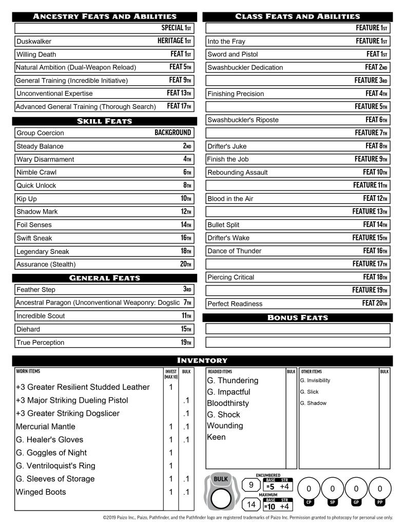 I kind of wish I didn’t have to take the swashbuckler feats, but parrying is too important to the character to ignore. Panache and Finishing Strike also work as the buff to offense that Tracking Shot offers. A lot of the remaining feats are all about keeping mobile and minimizing action costs. The amount of Steps and Strides this character can take without actually costing the actions to do so is higher than any other I’ve ever made.