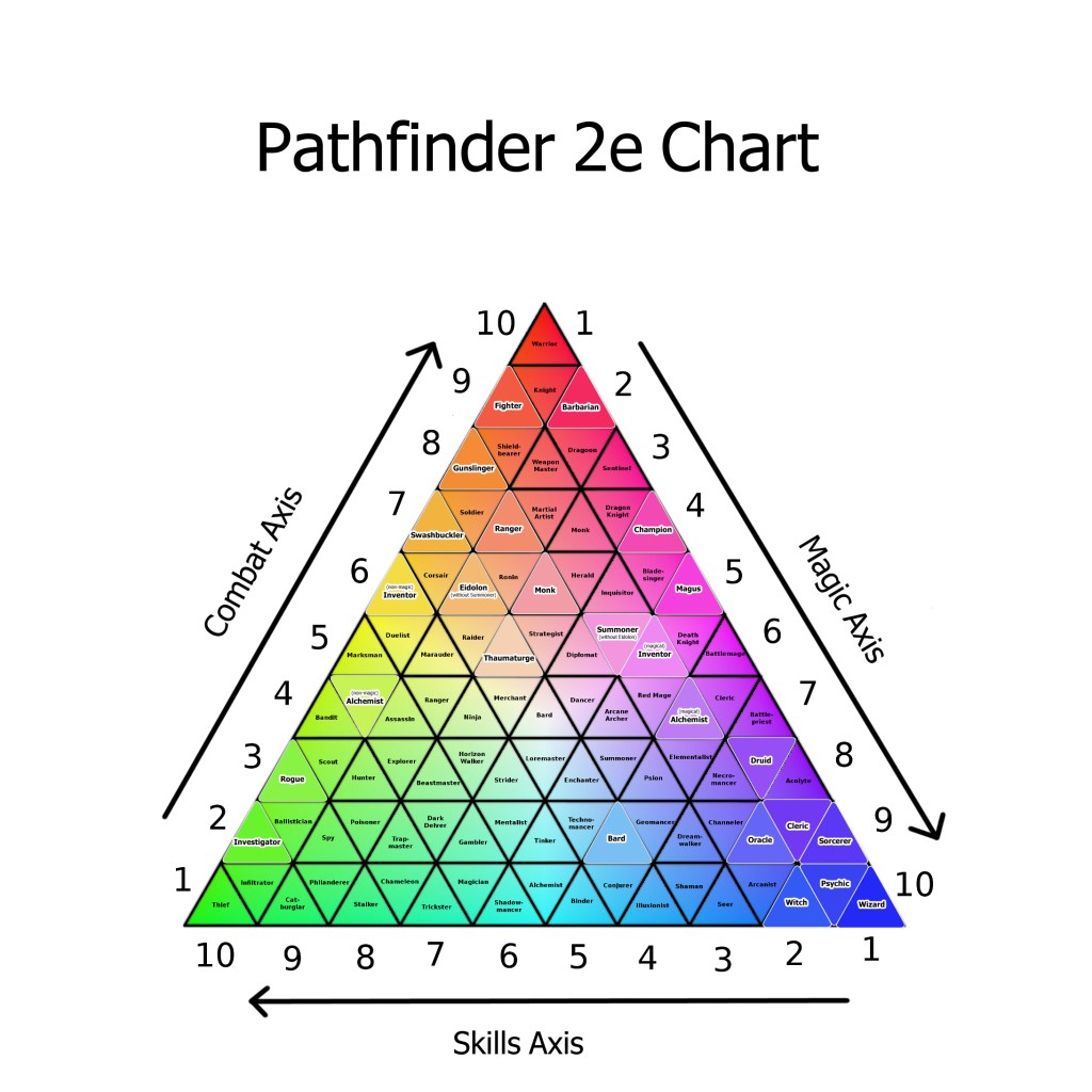 That took a while, but it’s done. Each class out thus far, numerically represented by the three areas of play. Again, to be clear, this is all very general. It’s a guideline to be used for very broad ideas of where a character might land. If you feel a class is misplaced on the pyramid, let me know how you’d alter it! I’d love to get input on how to make this a better tool for character building.