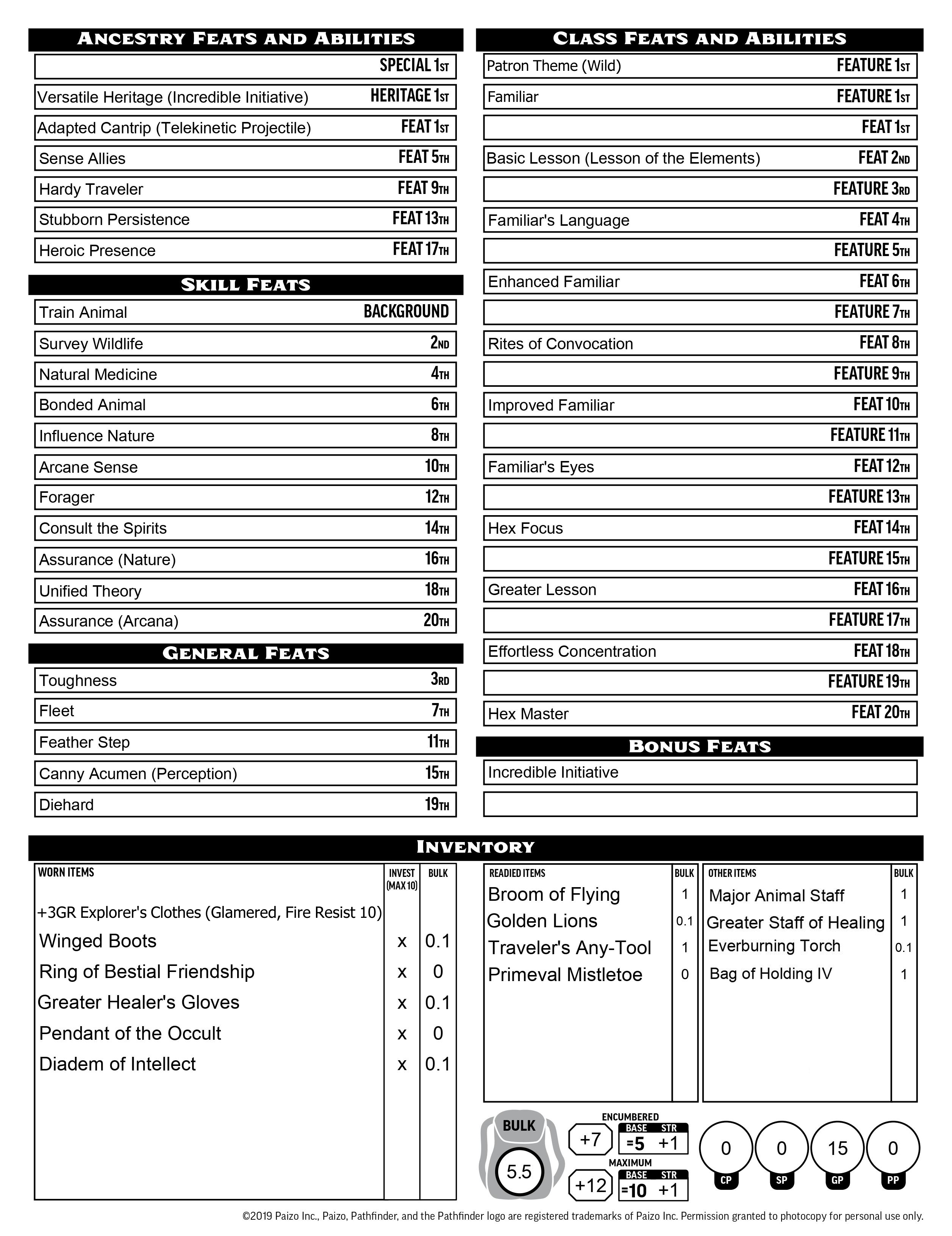 Familiars in PF2e, like most other things, are build-it-yourself. By default, you get two familiar abilities you can choose from this list. I’ve left this part off the character sheet as it’s something you can change each day, but good choices for a character like this might be to gain an extra cantrip, to have your familiar deliver spells for you, or have the familiar be able to speak one language. Witch not only gets a familiar for free at 1st level, but they also get bonus familiar abilities as they level, and you can increase this number even more with certain feats.