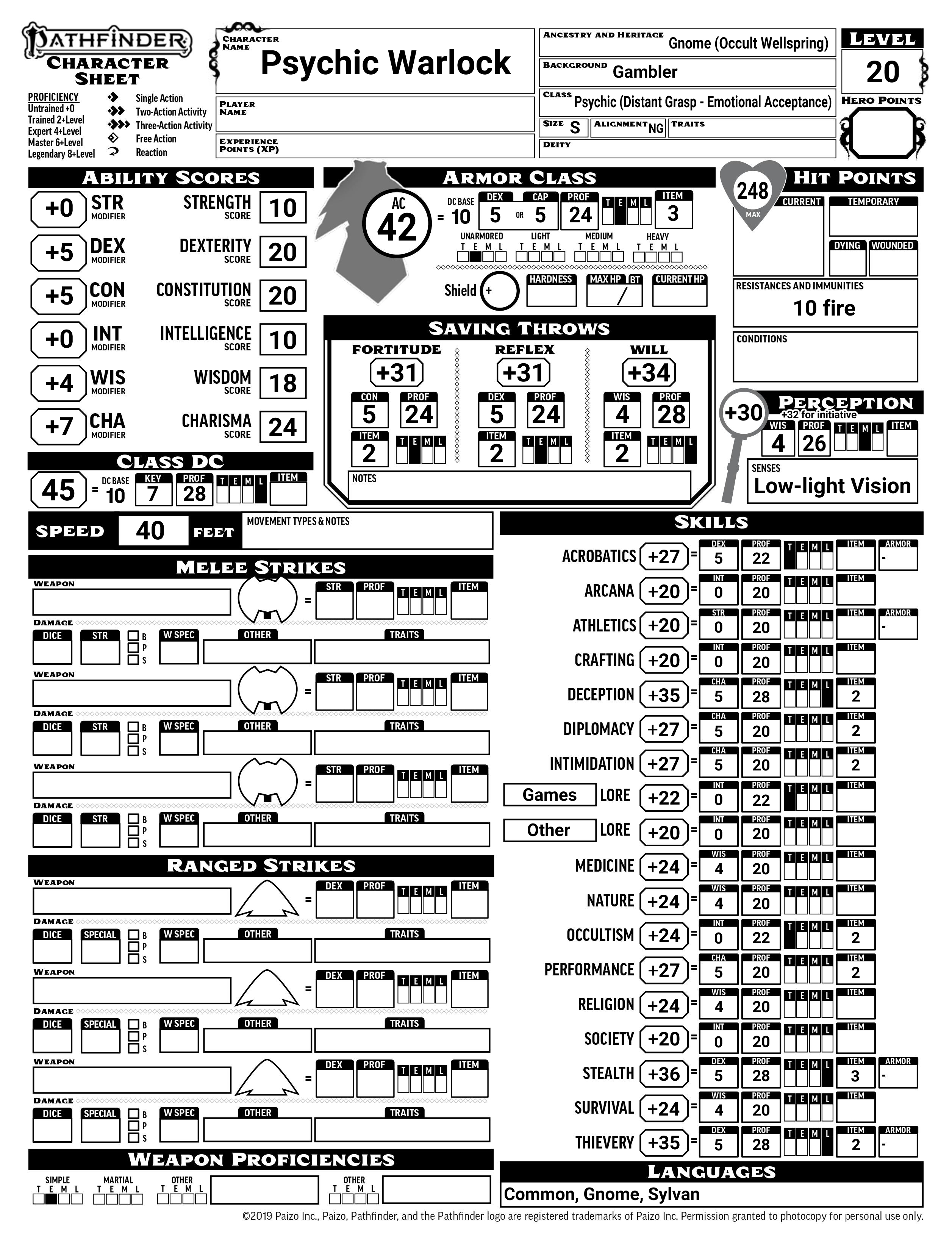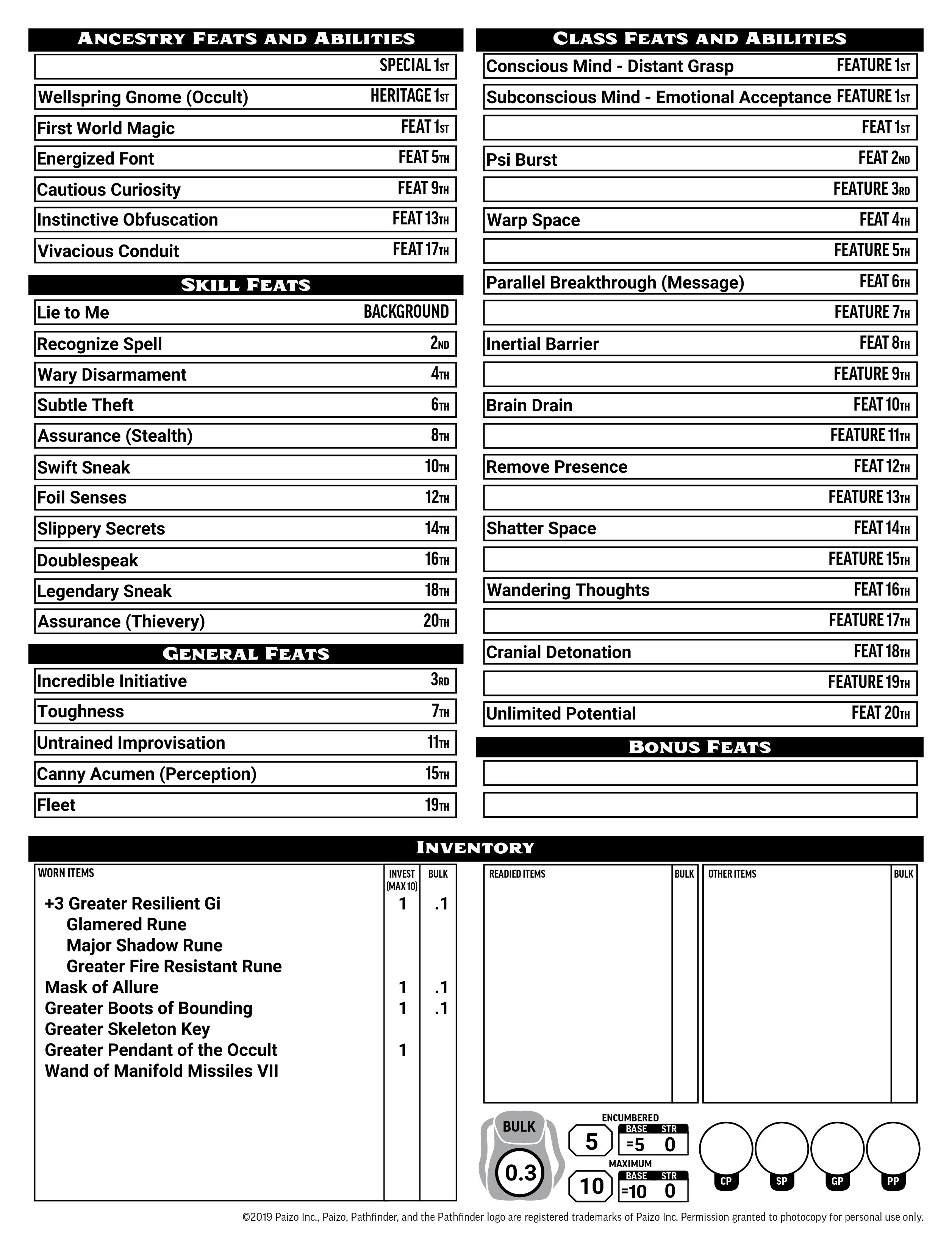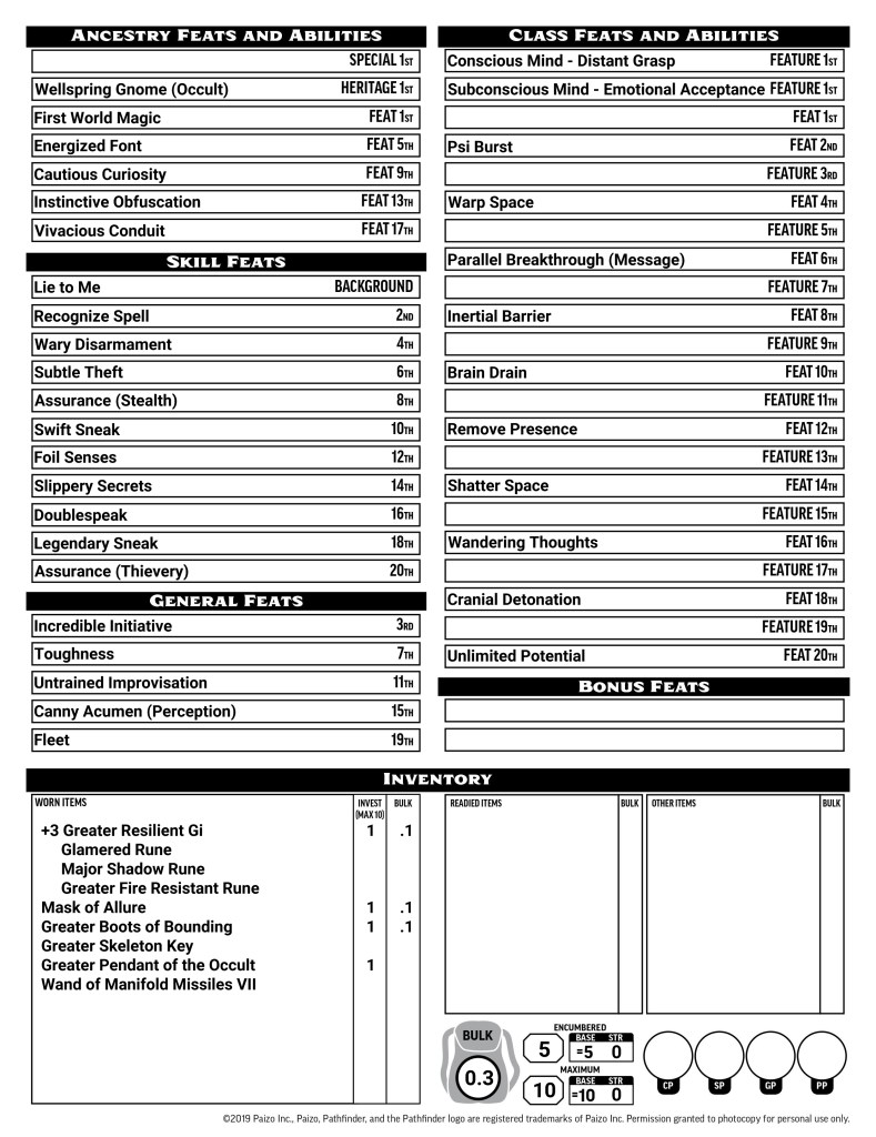 Stats are simple for Psychics, following the tried and true Dex+Con+Wis+main ability for the most part. Keeping your Charisma or Intelligence (depending on your Conscious Mind) maxed out lets you keep your spells as strong as possible. Dex, Con, and Wis are always good to prioritize for AC, HP, Perception, and saves. Str and either Int or Cha – whichever isn’t your spellcasting ability – are to personal preference and desired skills. For this character, keeping Str and Int low is just fine.