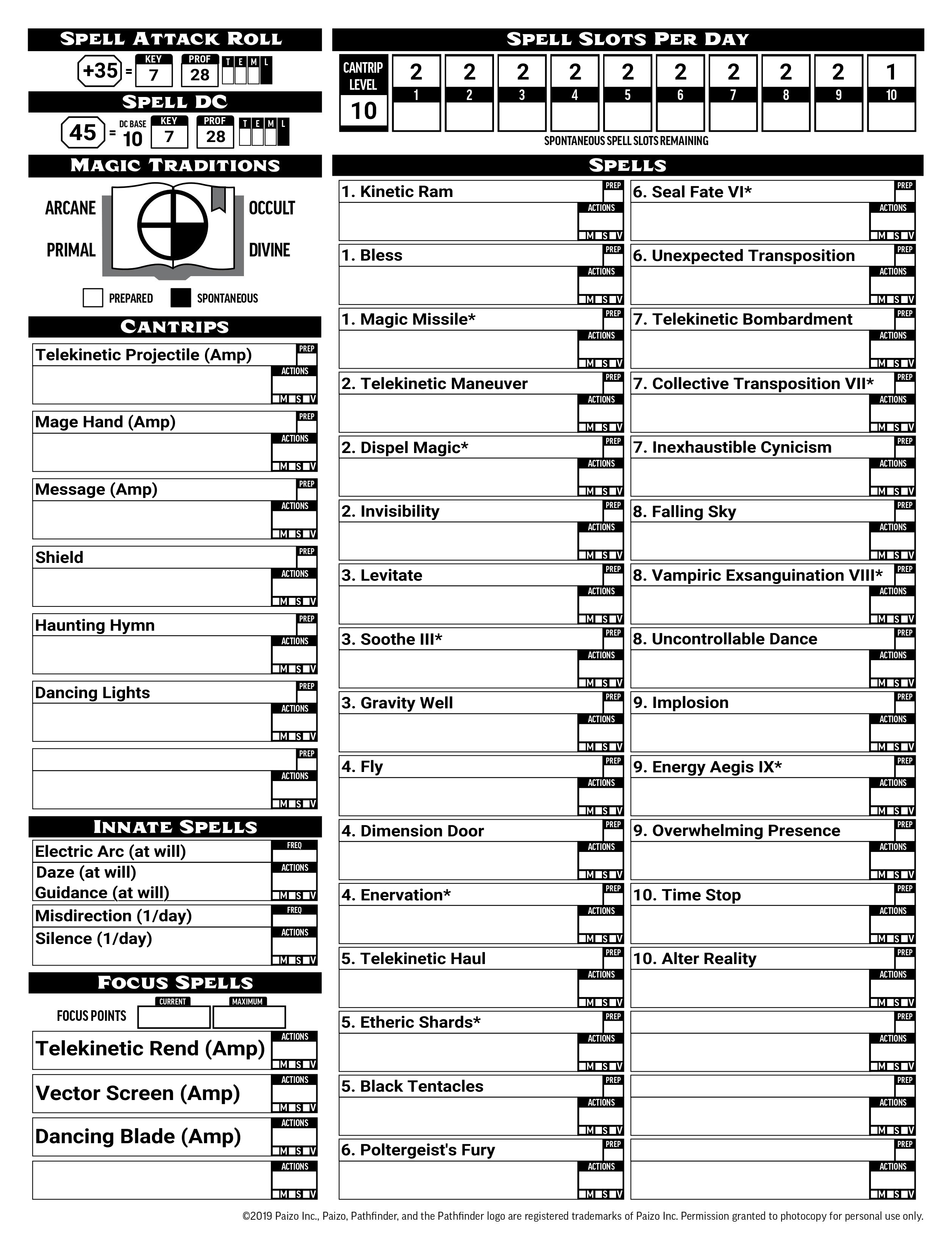 Unlike Witch and Magus, Psychic cannot just change which spells they have available each day. Also unlike those two, Psychic doesn’t have to decide every slot ahead of time; their spell slots can cast any spell of the correct level. You also get one ‘signature spell’ of each level that you can shift up or down to cast via different slots (denoted on the character sheet with an asterisk*). As always, spells are really up to your preference and campaign, though I do highly recommend two specific spells for signature status. First, magic missile is as reliable as damage can get, and increasing its level can let you pump out truly ridiculous amounts of missiles. Second, dispel magic needs to be a high enough level compared to the thing it’s attempting to dispel or it won’t work; making it a signature spell lets you adjust it to whatever level you need. Summoning spells get an honorable mention here as they also change a lot each level, but the occult tradition doesn’t have a ton of options for summoning, plus it’s not really this character’s focus.